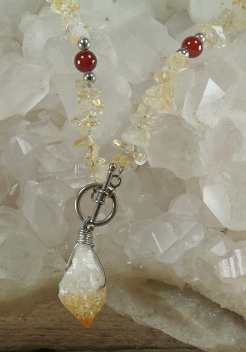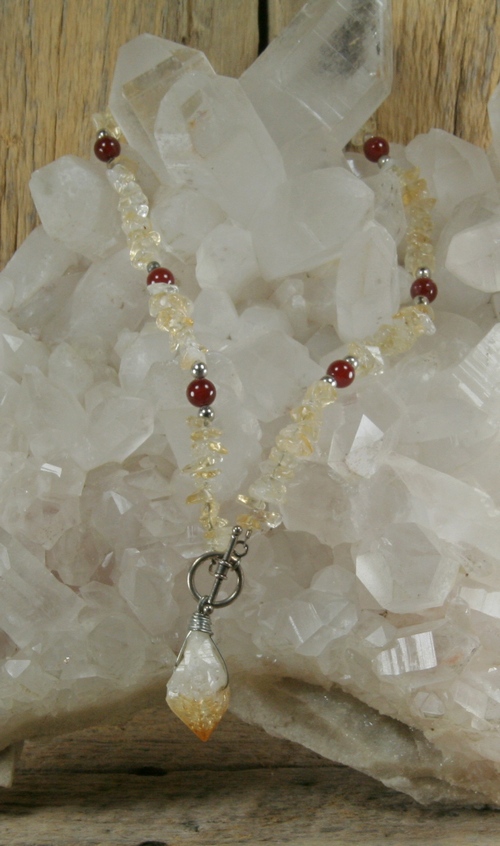 This necklace is made with Citrine chips, 7 - 8mm Carnelian beads and 14 Sterling Silver beads. It is finished off with a Sterling Silver toggle clasp which has wire wrapped Citrine point. The length of the necklace is approx. 18".
