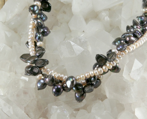 This 3 strand necklace is made with 2 strands (123 beads) Peacock dyed, teardrop shaped pearls with 24 - 4mm Pink Pearl beads and one strand of Pink Pearls (114 - 4mm) and 3 Peacock Pearls. It is finished off with a Sterling Silver toggle clasp and is approx. 17" long.