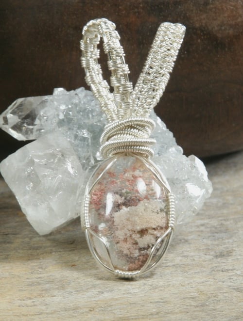 This pendant is made by wire wrapping a 1" x 3/4" Lodolite (Inclusion Quartz) cabochon with tarnish resistant Silver plated wire. The bail is large enough so that it can be worn with the Horse Hair necklaces.