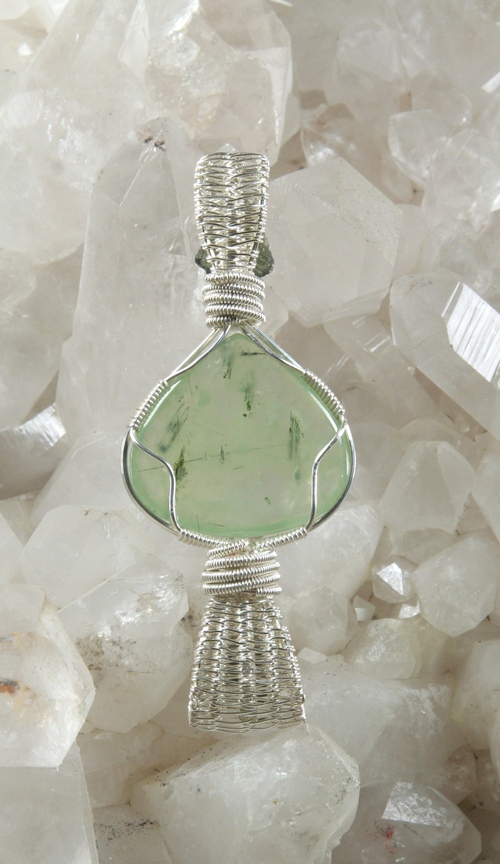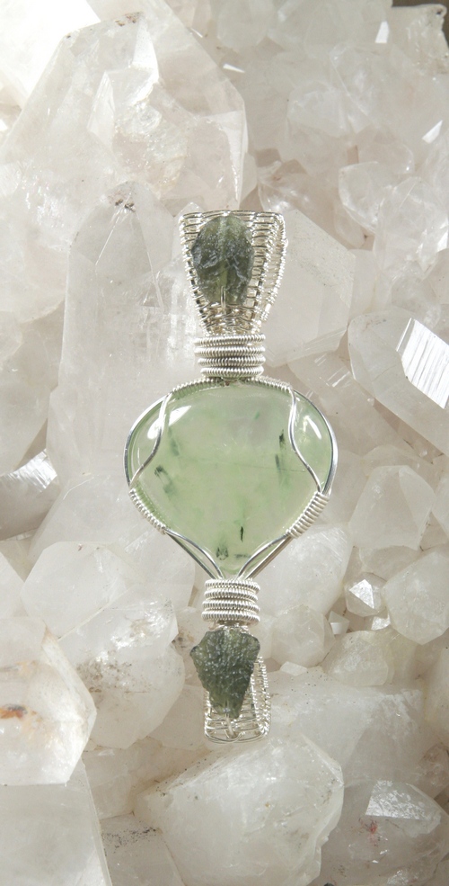 This piece is made with a 46.95ct (28x31mm) Prehnite with Epidote needles cabochon and 2 Moldavite beads (approx. 1/2"x3/8") wire wrapped onto either of the two bails with non-tarnish silver wire. This is a double bail pendant so that it can be worn with the teardrop shape facing up or down. The back side is equally finished so you could in essence wear it reversed. The total length of the pendant is almost 3 1/2" long and almost 1 1/2" wide.