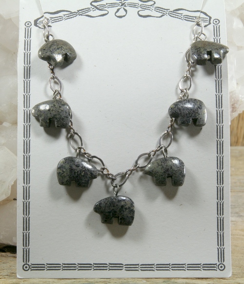 This necklace is made using by attaching 13 Pyrite Spirit Bear beads to Sterling Silver chain. It is finished off with a large silver plated barrel clasp and is approx. 16" long.