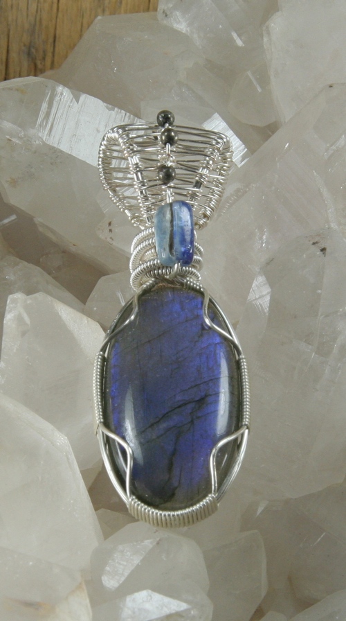 This pendant is made by wire wrapping a 1 3/4" x 1" beautiful Labradorite cabochon with a lot of blue flash with tarnish resistant silver wire. Wrapped into the bail is a 4x8mm Blue Kyanite rectangle and 4 - 3mm Pyrite beads. The bail is large enough to wear with the Horse Hair necklaces.