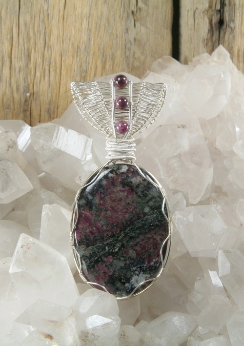 This pendant is made by wire wrapping a 2 1/2" x 2" Eudialyte cabochon with tarnish resistant silver wire. Wrapped into the bail are 5 - 6mm Ruby beads. The bail is large enough to wear with the Horse Hair necklaces. The total length of the pendant is 4" and the width is 2".