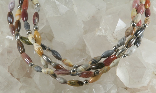 This 4 strand necklace is made using 122 mixed Jasper rice shaped beads, 36 Sterling Silver beads and 10 Sterling Silver rice shaped beads. The necklace is finished off with a Sterling Silver toggle clasp.