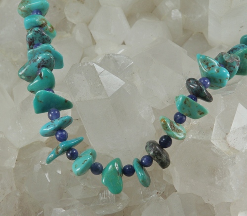This necklace was made by alternating 48 Turquoise nuggets with 49 - 4mm Sodalite beads. It is finished off with a Sterling Silver toggle clasp. It is approx. 18" long.
