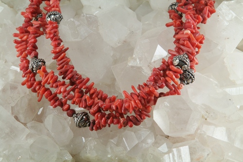 This 4 strand necklace is made with approx. 64" of Red Coral chips and 12 - 9mm Bali Silver beads. It is finished off with a Sterling Silver toggle clasp and is approx. 18" long.
