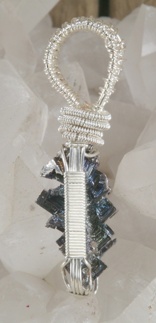 This Bismuth is lab created in Canada. Bismuth is a crystalline, brittle metal that is silvery-white with an iridescent hue. This piece is wire wrapped with anti-tarnish silver wire and is approx. 2 1/2" long and 1" wide. The bail is large enough to use with the horse hair necklaces.