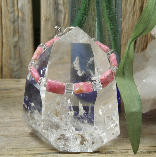This bracelet is made with 1/2" rectangular Rhodochrosite beads and cut and polished Herkimer Diamond cubes. Bracelet is finished off with a Sterling Silver toggle clasp. The bracelet, including clasp, is approximately 8" in length.