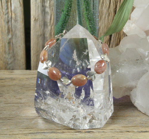 This piece is made alternating 7 - 1/2" nice quality, oval Sunstone beads with Sterling Silver beads and finished off with a Sterling Silver toggle clasp. The bracelet, including clasp, is approximately 8" in length.