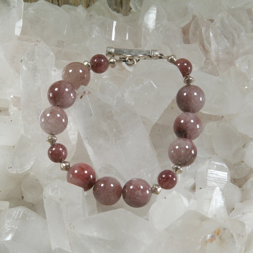 This bracelet is made using 9 - 12mm Red Rutilated Quartz beads, 4 - 8mm Muscovite beads and Sterling Silver spacers beads. The bracelet is finished off with a Sterling Silver toggle clasp. The bracelet, including clasp, is approximately 8" in length.