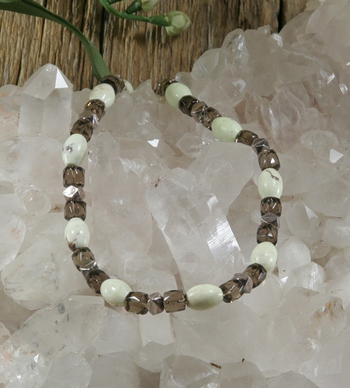 This necklace is made with Oval shaped Lemon Chrysoprase beads, faceted cube shaped Smokey Quartz and Sterling Silver beads and finished off with a large silver plated barrel clasp. The necklace, including clasp, is approximately 18" in length.