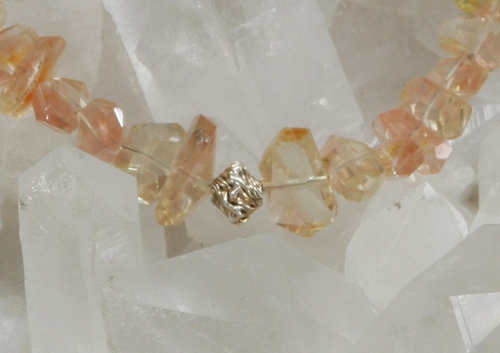 This necklace is made using 53 faceted, gem grade, Sunstone nuggets and 7 -7.7mm Sterling Silver beads. The necklace is finished off with a Sterling Silver toggle clasp with 2 Onyx cabochons at each end of the toggle and including clasp is approximately 18" long.