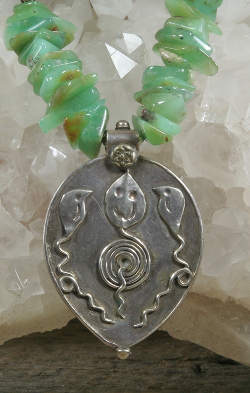 This necklace is made using large Chrysoprase chips, 6mm Sterling Silver beads, 4 - 18mm Green Tiger Eye beads and an old Sterling Silver Pendant with Cobras on it. The necklace is finished off with a large barrel clasp and including clasp it is approx. 22" long. The pendant was actually found in a bin with a bunch of old, tarnished silver pendants. I have cleaned it the best it can possibly be and it is 3" long and 2" wide.