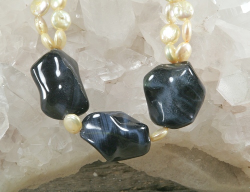This necklace is made using two strands of 8mm Yellow Freshwater Pearl coins, 52 in all, and 3 large Blue Tiger Eye nuggets. It is finished off with a Sterling Silver hook and eye clasp and including clasp is approx. 17" long. The Blue Tiger Eye nuggets are approx. 1 1/2" x 1".