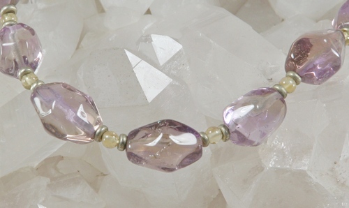 This necklace was made alternating large Ametrine nuggets with Sterling Silver spacer beads and 4mm Citrine beads, ending with 2 strands of light Amethyst chips and a Sterling Silver box clasp. The necklace is approx. 17" in length, including clasp.