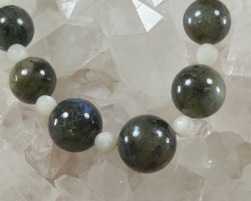 This necklace is made by alternating graduated Labradorite beads ranging in size from 12mm to 20mm and faceted 6mm Rainbow Moonstone beads. The necklace is finished off with a Sterling Silver toggle clasp and is approx. 17" long, including clasp.
