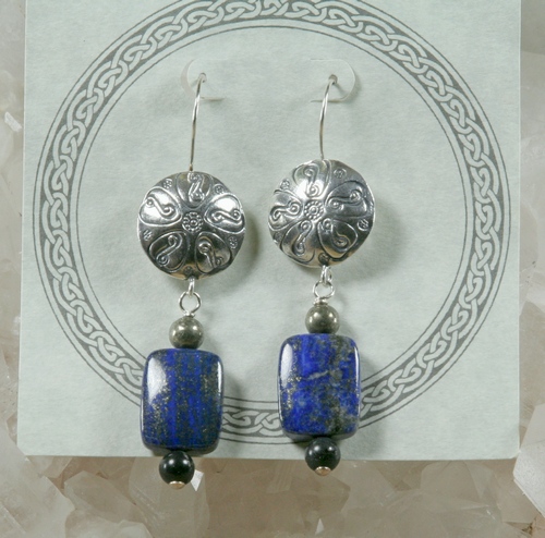 These earrings are made with Lapis squares that are approx. 5/8" long and 1/2"wide and 6mm Pyrite beads which are attached to Hill Tribe Silver earrings that have a large, stamped silver disc. They dangle approx. 2" from the top of the silver disc.