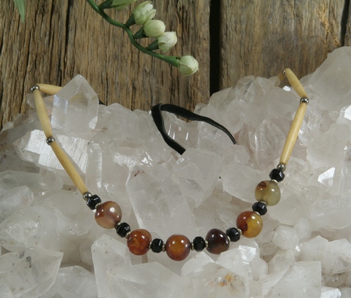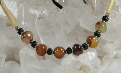 This necklace is made using antiqued cow bone and alternating 14mm chunky Carnelian nuggets with 8mm hexagonal cut Onyx, Sterling Silver spacer beads and 4mm Sterling Silver beads. The necklace is finished off with black leather tabs and ties so that you can adjust the length of the necklace. The beaded/bone portion is approx. 15" long.