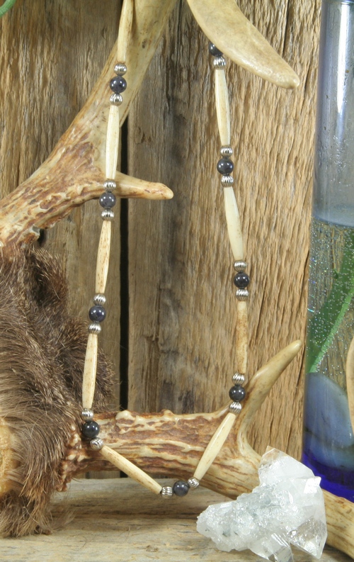 This necklace is made using cow bone that has been antiqued by boiling in tea, fluted, non-tarnish tin beads and 6mm Iolite beads. It is finished off with a large silver plated barrel clasp and is approx. 16" in length.